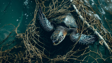 Aerial view of ocean waters littered with floating plastic debris, showing a turtle entangled in plastic bags and fishing nets.. AI generated.