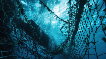 Marine life struggle: fish and coral tangled in ocean fishing net.