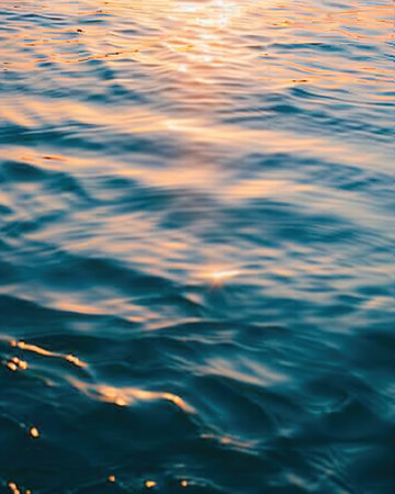 A serene view from just below the waters surface, capturing the gentle movement of teal waves as the golden sun sets, creating a beautiful and peaceful natural scene.