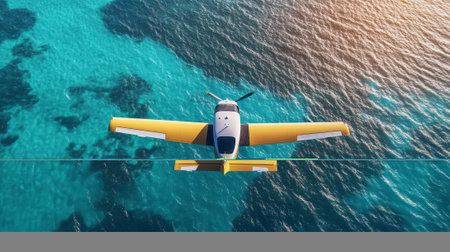 Aerial view of a yellow airplane flying in the blue sea.