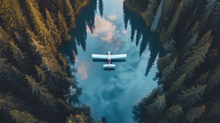 A serene aerial view capturing a single airplane resting on calm water, surrounded by dense forests, reflecting a vibrant sky. Perfect for travel themes.