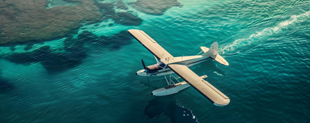 Vintage seaplane gracefully flying over a mesmerizing turquoise tropical seascape evoking a sense of retro adventure and tranquil escapism