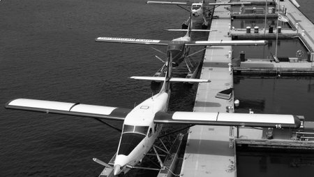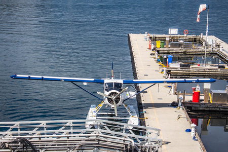 Vancouver, Canada - May 29, 2019: Plane waterfront station. Cessna 206 seaplane. Cessna 206 plane in seaplane terminal. Vancouver harbor airport. Seaplane tour. Retro planes in harbor