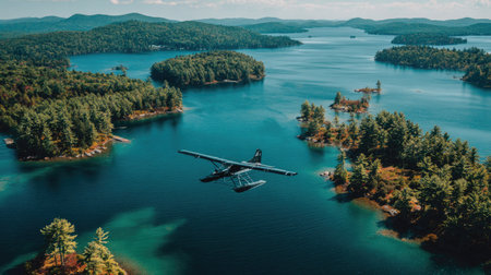 A seaplane flies above a tranquil turquoise lake dotted with numerous green islands. The scene presents vibrant colors with a focus on natural elements. The composition features overhead lighting. Ideal for illustrations or imagery used in travel, tourism, and environmental projects.