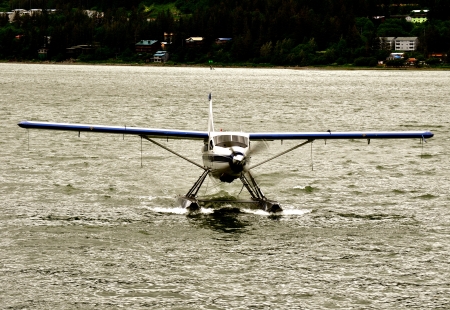 single-engined Seaplane coming in to land in Ketchikan, Alaska