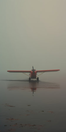 a red plane rests peacefully on the water, capturing the essence of hazy romanticism. this photograph showcases detailed portraitures with a touch of farm security administration aesthetics. shot in 32k uhd using a leica cl, the image is bathed in a soft palette of light gray and amber. the use of high-speed sync adds a dynamic element to the composition. ai generated