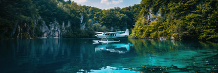 Small white airplane parked on water edge in rich green landscape. Serene scene with verdant trees and rolling hills in distance. Perfect for travel agency and tours to Plitvice Lakes in Croatia.