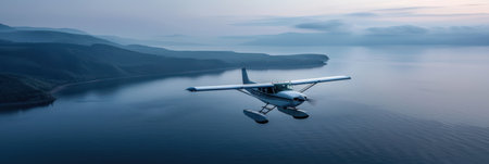 A seaplane gracefully touching down on the surface of a tranquil lake, its water skis creating ripples as it glides to a gentle stop, blending adventure with serenity.
