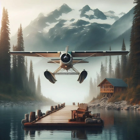 A seaplane docking at a wilderness lodge pier, Ai generated image