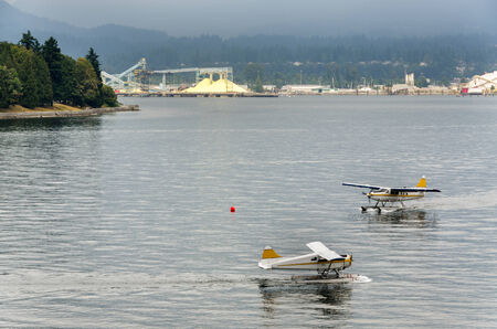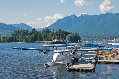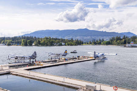 Vancouver city seaplanes airport. Harbor aviation in downtown - planes stand on water nearby pier