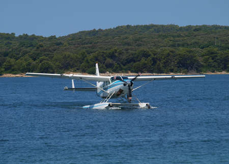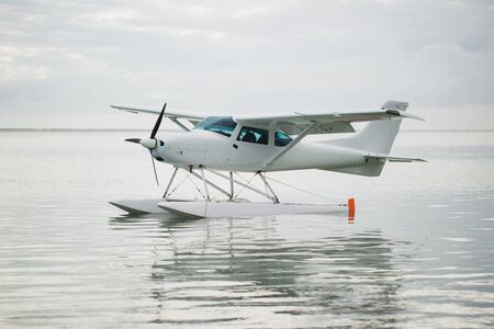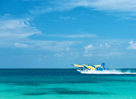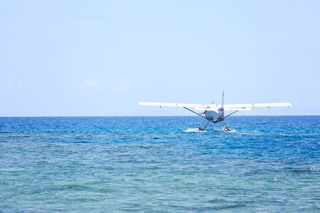 The seaplane landed in the Maldives at sea. Seascape in the tropics
