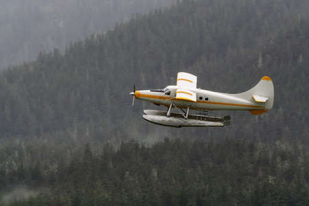 Juneau, Alaska, United States. Floatplane flying near a small touristic town during a rainy morning.