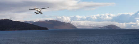 Seaplane flying over Canadian Mountain Nature Landscape on the Pacific West Coast. Cloudy and fog Spring Day. 3d Rendering Airplane Adventure Concept. Vancouver, British Columbia, Canada.