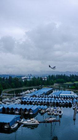 Downtown Vancouver, British Columbia, Canada - September 21, 2019: Floatplane in Vancouver Harbour during a cloudy evening.