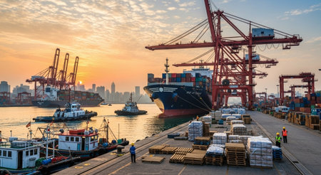 A bustling port, with cargo ships and cranes, showcasing the global trade and commerce that drives the economy of a commercial city. Transportation and shipping concept. Copy space