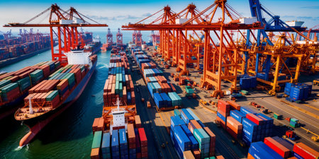 Aerial View of Bustling Container Port with Cargo Ships, Cranes, and Colorful Shipping Containers in Global Trade Hub