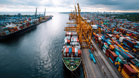 This aerial image showcases a container ship docking at a busy port, surrounded by colorful shipping containers and heavy machinery, highlighting maritime transportation.