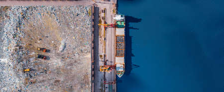 Waste loading at port cargo ship transports of garbage for recycling factory. Concept plastic Pollution environment, aerial top view