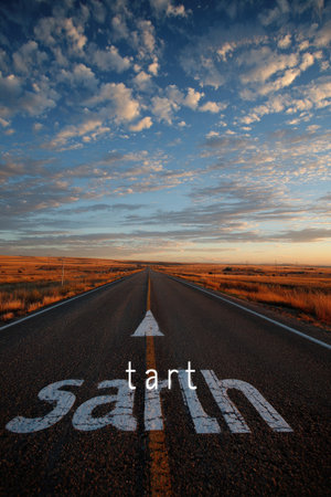 An asphalt road stretches into the distance, marked with painted text and an arrow, leading towards a vanishing point under a dynamic sky. The composition features earth tones of the landscape against a vibrant blue and white sky. This image is suitable for various commercial uses, including advertising and editorial content.