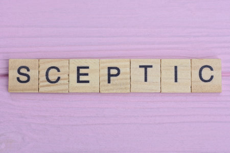 word sceptic from gray wooden small letters with black font on an pink background