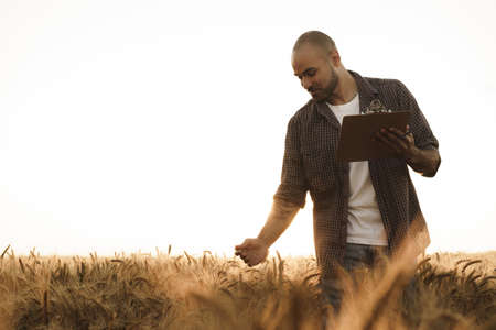 Farmer checking wheat field progress. Agronomist inspector who examines the wheat plantation and makes notes in documents. Agro business