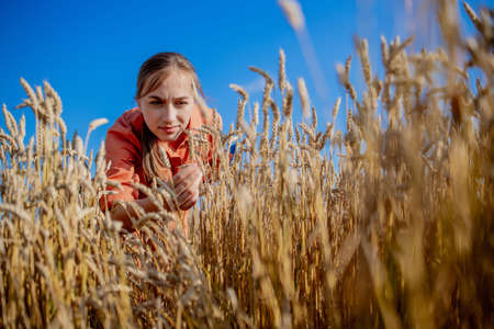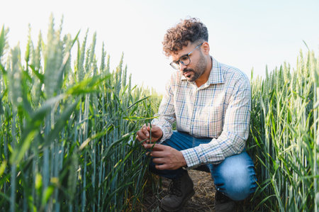 Agronomist crouching in a lush wheat field, carefully examining crop growth and assessing the overall health of the plants