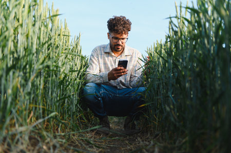 Agronomist crouching in wheat field using smartphone for crop analysis, implementing modern technology in agriculture