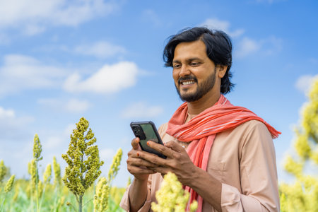happy farmer using mobile phone at corn field - concept of technology, connection and modern village farmer
