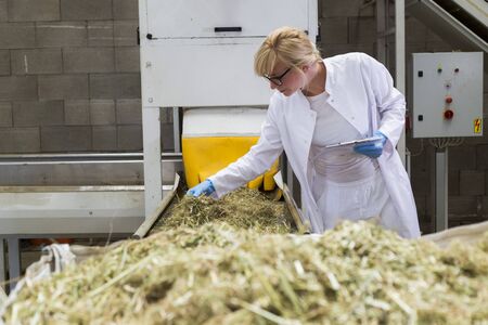 Scientist observing dry CBD hemp plants by the sorting machine in factory and taking notes. She is smiling and happy with results