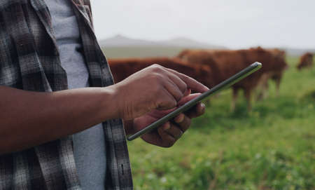 Agricultural management gets an upgrade. Shot of an unrecognisable man using a digital tablet while working on a cow farm.