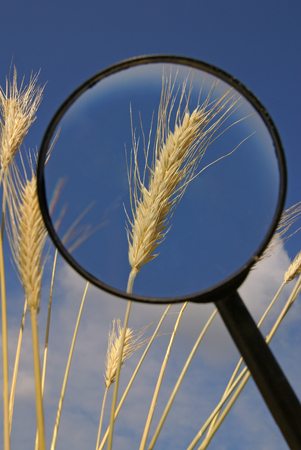 Grain ears under a magnifying glass and blue sky on