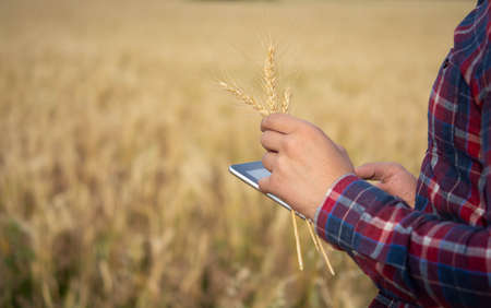 The farmer examines ears of ripe wheat through a magnifying glass
