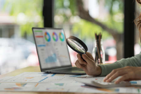 Portrait of Business woman using magnify to audit the companys financial results and budget. Account Audit Concept.