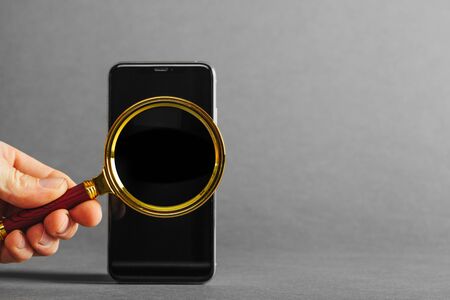 People hand using mobile phone or smartphone searching for information in internet online society web with search box icon and copyspace.