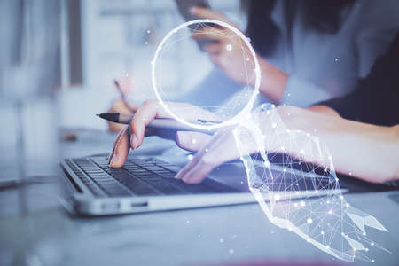 Data Search Technology Search Engine Optimization. People hands using laptop or computer searching for information in internet online society web with search box icon at table indoors