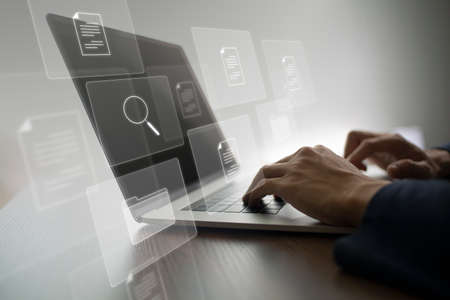Searching browsing data information network concept. Businessman using laptop computer to input keyword for search and find knowledge.