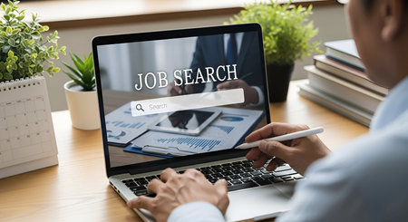 Person searching for jobs online using a computer with digital JOB SEARCH text overlay, representing online recruitment, career development, remote work, and modern employment technology.