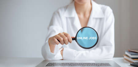 Woman holding through magnifying glass and search online jobs, Searching for information on internet networking.