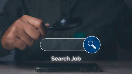 A close up view of a hand holding a magnifying glass that focuses on the glowing blue word job amidst a futuristic digital background symbolizing modern employment search and recruitment opportunities.