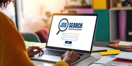 Individual types on a laptop with Job Search displayed searching, a digital concept portrayed.
