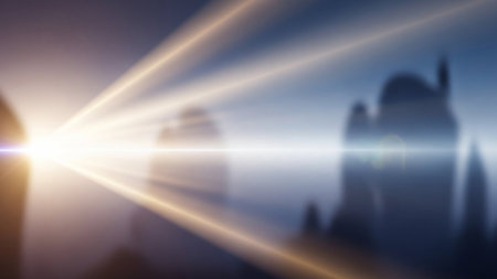 Abstract scene with bright lens flare and light beams illuminating blurred, silhouetted structures in a hazy atmosphere.
