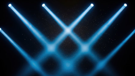 The image showcases a dramatic scene with four intersecting blue spotlights against a dark background. The beams of light create a geometric pattern, forming an 'X' shape as they converge. The vibrant blue color of the spotlights contrasts sharply with the surrounding darkness, creating a visually striking effect.