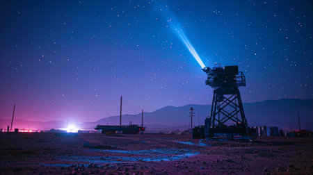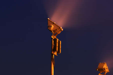 Vintage nautical spotlight illuminating foggy sea horizon at dusk.