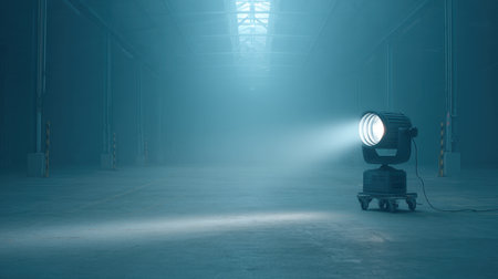 A captivating spotlight shines in a vacant industrial space, creating a moody atmosphere with its captivating beam and soft blue haze, perfect for film production and photography.