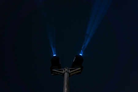 Blue spotlight rays. Projector light rays background photo. Night event concept photo.
