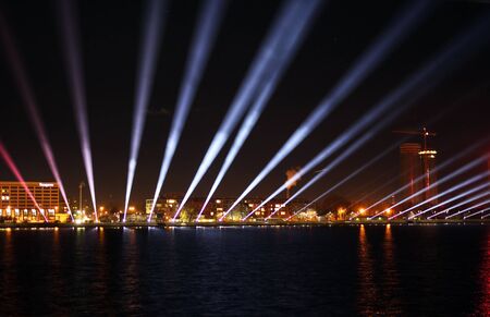 The view on the Daugava shore in Riga with the light show in the night