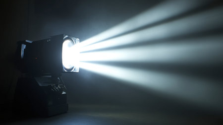 A powerful spotlight casts bright beams of light into a dark space, creating a dramatic atmosphere perfect for theatrical performances and events.