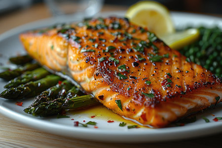 A beautifully grilled salmon fillet served on a white plate with colorful vegetables and a lemon wedge, perfect for a delicious and healthy dining experience.