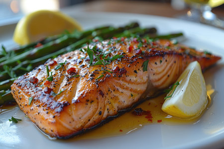 AI Generated. Grilled Salmon with Roasted Asparagus and Lemon Butter Sauce