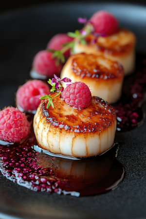 Seared scallops with raspberries, artistic plating, delicate presentation